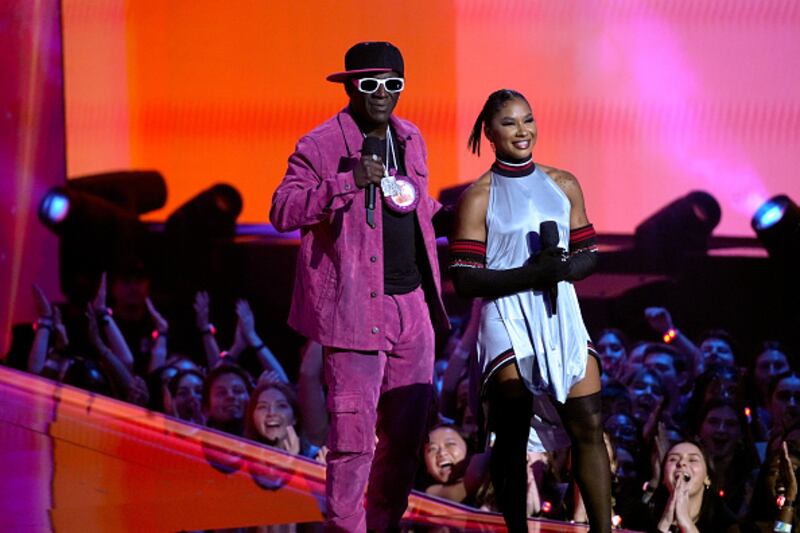 2024 MTV Video Music Awards - Show ELMONT, NEW YORK - SEPTEMBER 11: (L-R) Flavor Flav and Jordan Chiles speak on stage during the 2024 MTV Video Music Awards at UBS Arena on September 11, 2024 in Elmont, New York. (Photo by Arturo Holmes/Getty Images) (Arturo Holmes/Getty Images)