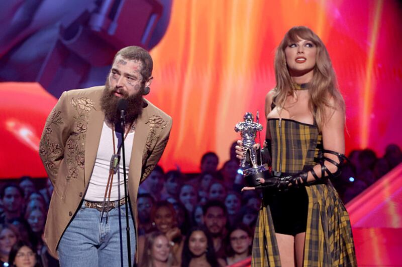 2024 MTV Video Music Awards - Show ELMONT, NEW YORK - SEPTEMBER 11: (L-R) Post Malone and Taylor Swift accept the Best Collaboration award for "Fortnight" on stage during the 2024 MTV Video Music Awards at UBS Arena on September 11, 2024 in Elmont, New York. (Photo by Mike Coppola/Getty Images for MTV) (Mike Coppola/Getty Images for MTV)