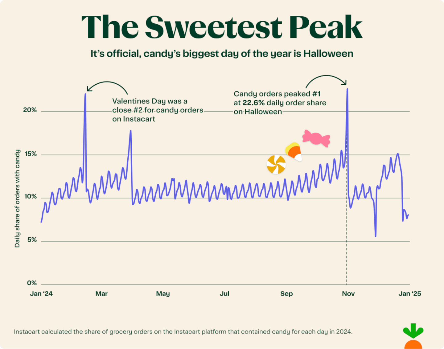 These days, Halloween doesn't wait for October — the season seems to sneak up sooner and sooner. From candy corn to cobwebs, consumers dive into the festivities well before pumpkins take over porches and store aisles. From sweet treats to spooky décor, Instacart data shows that October is one of the most festive times of the year, and candy takes center stage.
