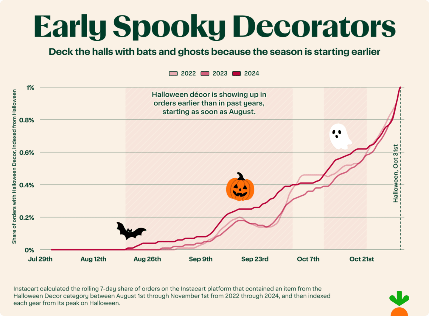 It’s not just candy that marks the start of spooky season — decorations set the tone too. Instacart data shows that in 2024, households began decking out their homes earlier than in years past. While 2022 and 2023 didn’t see a real pickup until the week of September 7, last year, consumers were already adding Halloween decor to their carts by the week of August 24. So if it felt like those inflatable ghosts and giant spiders showed up sooner than usual, you were right.