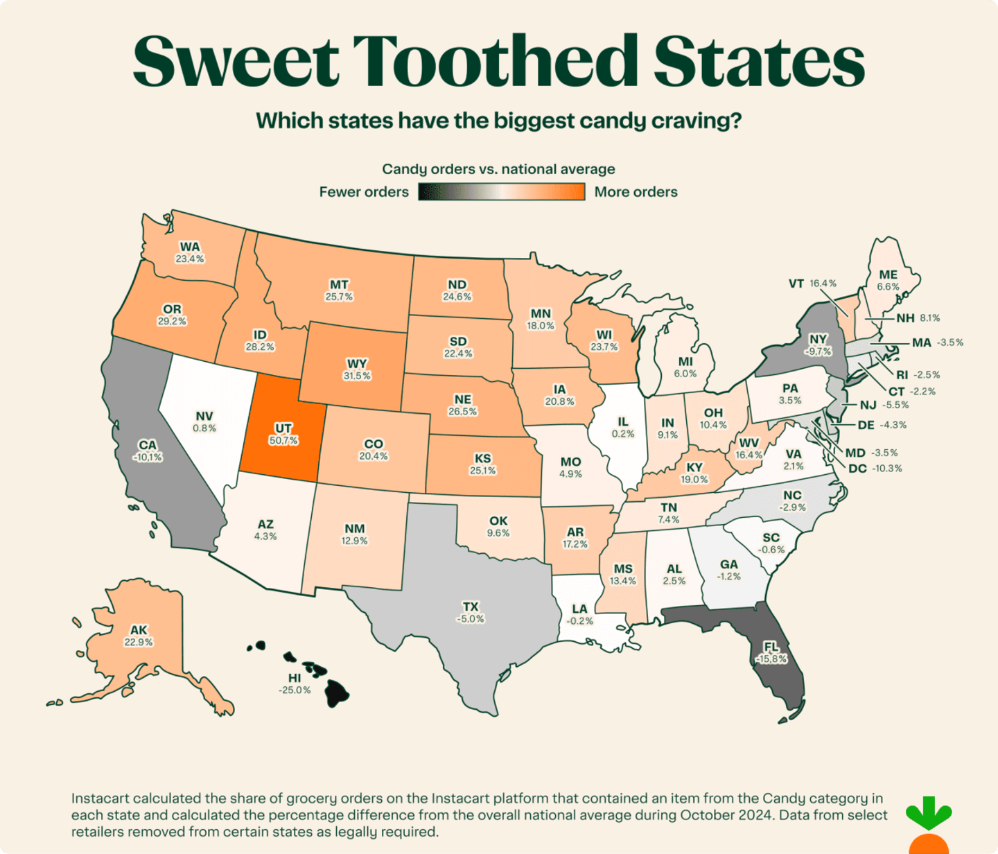 Who loads up on candy the most? Since Utah’s first full year on the Instacart platform, Utah has once again decisively claimed the crown, buying candy 50% more often than the national average in October 2024. The Mountain West and Midwest dominated the leaderboard, with Wyoming, Oregon, Idaho, and Nebraska rounding out the top five. On the flip side, states like Hawai‘i, Florida, and California purchased candy at rates well below the national average — proof that America’s sweet tooth isn’t evenly shared.
