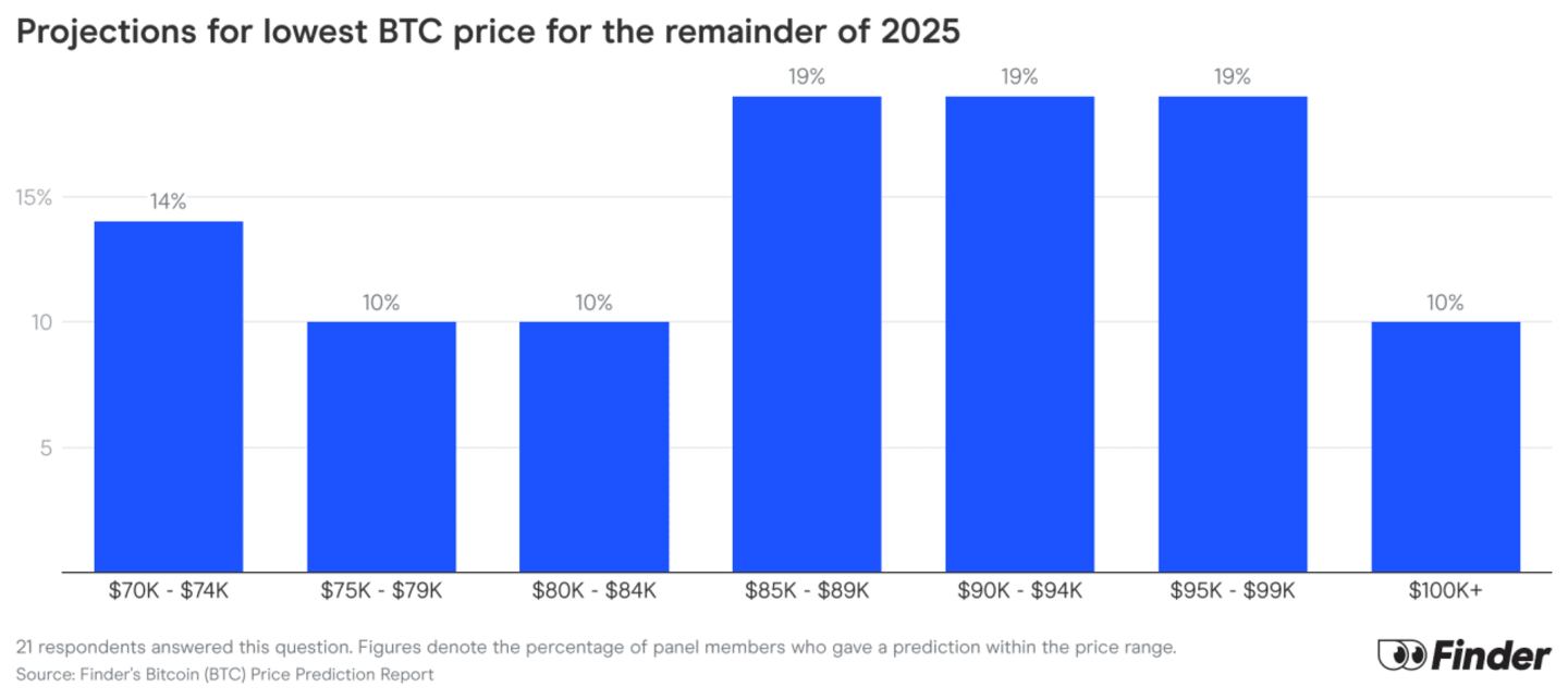 The average lowest price the panelists predict bitcoin will hit at some point in 2025 is $87,618, with some predicting it will fall as low as $70,000.