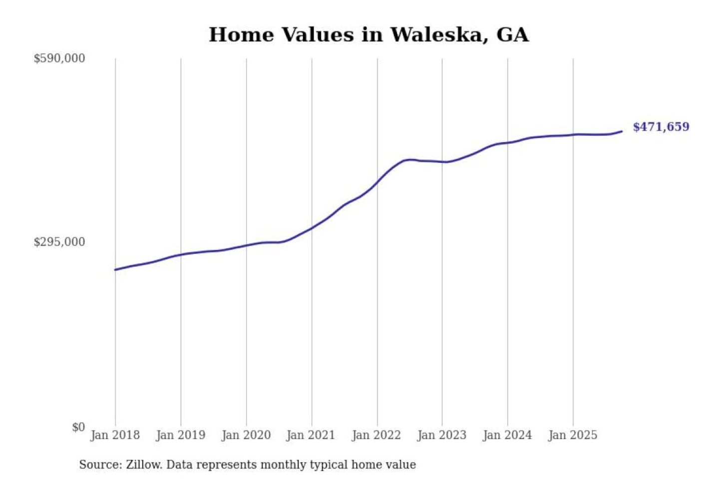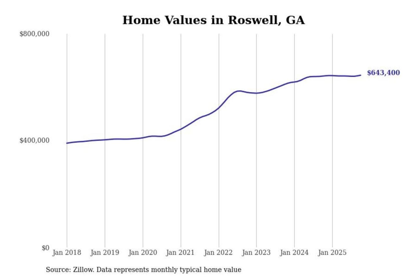 Stacker compiled a list of cities with the most expensive homes in the Atlanta-Sandy Springs-Alpharetta, GA metro area using data from Zillow. Charts show the monthly typical home value since January 2018.