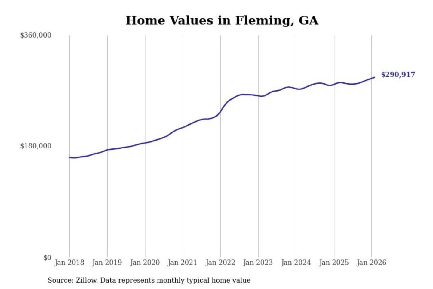 Stacker compiled a list of cities with the most expensive homes in the Hinesville, GA metro area using data from Zillow. Charts show the monthly typical home value since January 2018.