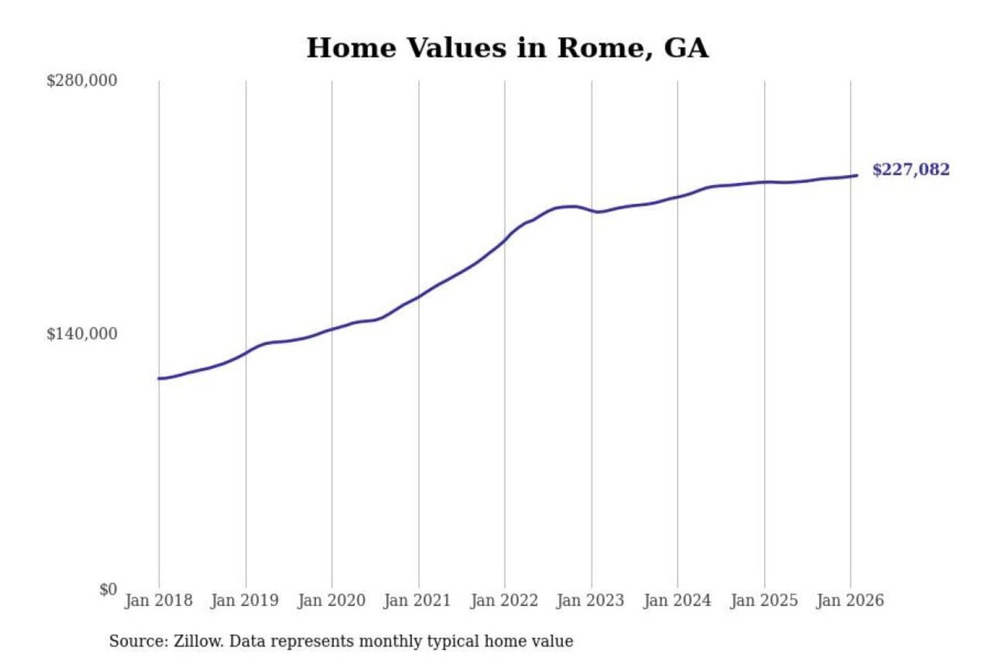 Stacker compiled a list of cities with the most expensive homes in the Rome, GA metro area using data from Zillow. Charts show the monthly typical home value since January 2018.