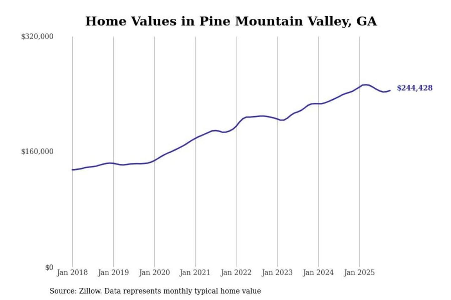 Stacker compiled a list of cities with the most expensive homes in the Columbus, Georgia metro area using data from Zillow. Charts show the monthly typical home value since January 2018. All 23 cities and towns with data available were included in the list.