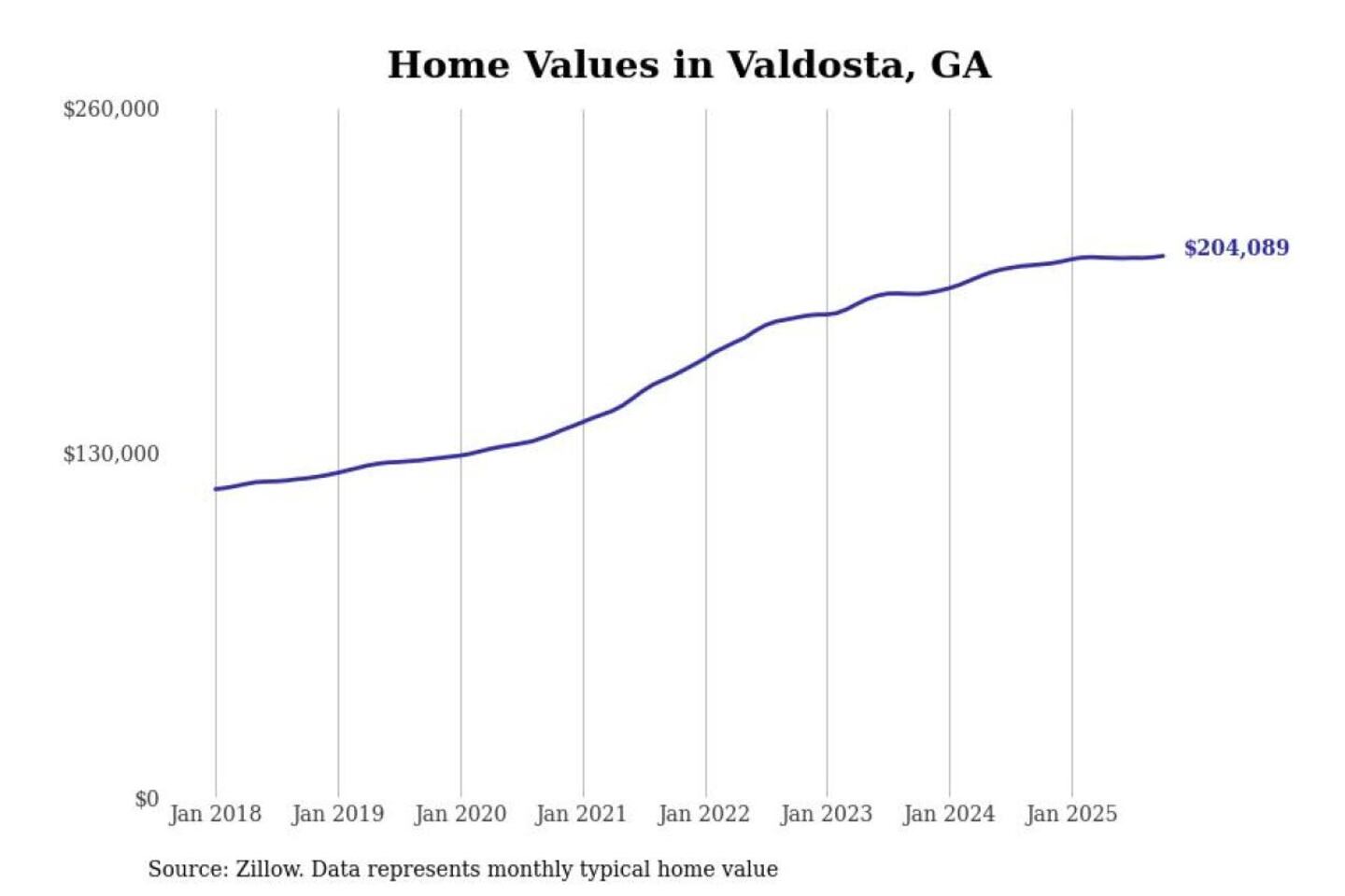 Stacker compiled a list of cities with the most expensive homes in the Valdosta metro area using data from Zillow. Charts show the monthly typical home value since January 2018. All 17 cities and towns with data available were included in the list.