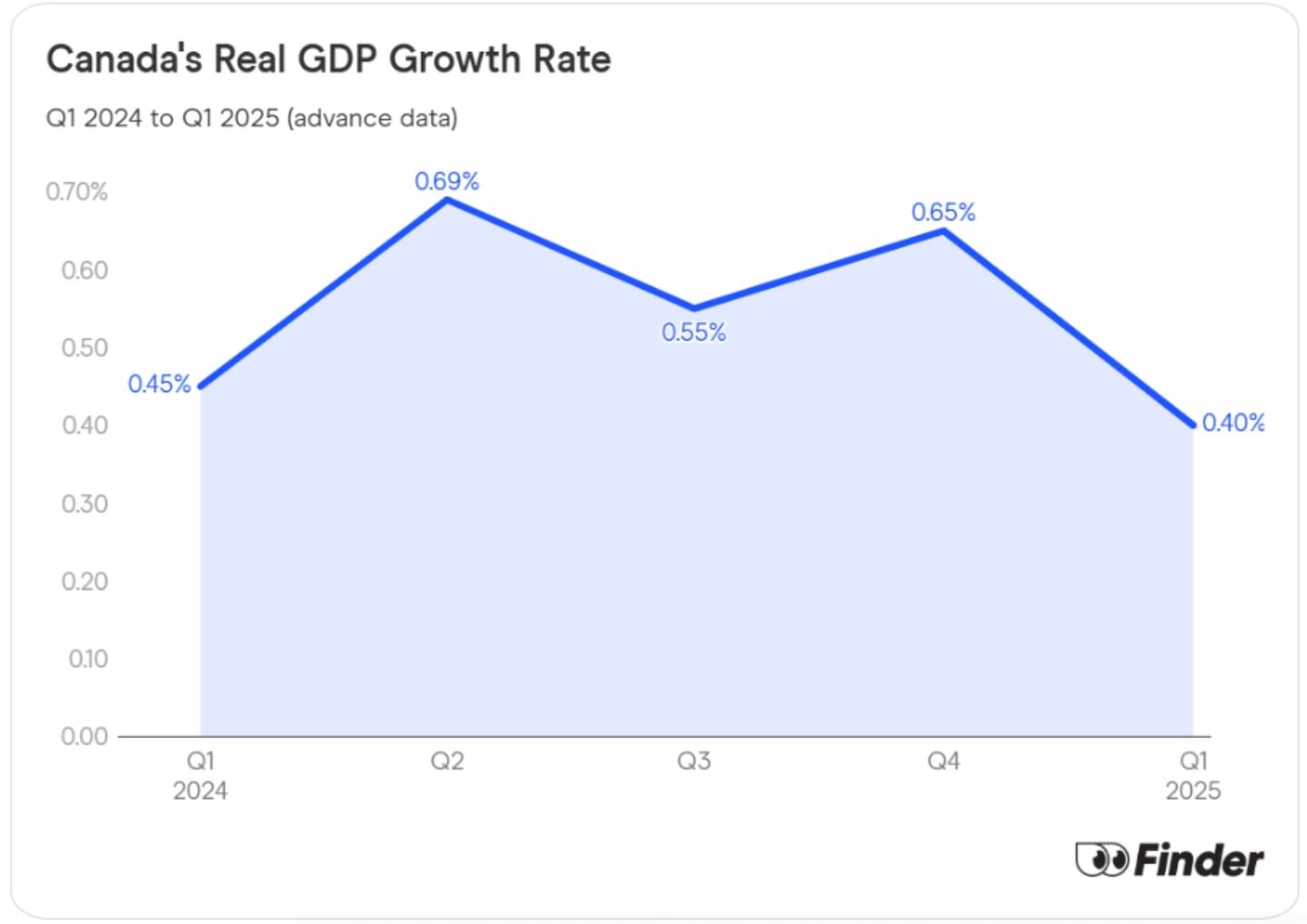 that Canada’s real GDP growth went down by 0.15% in the first quarter of 2025 from 0.65% to 0.4%. That’s not good, but
