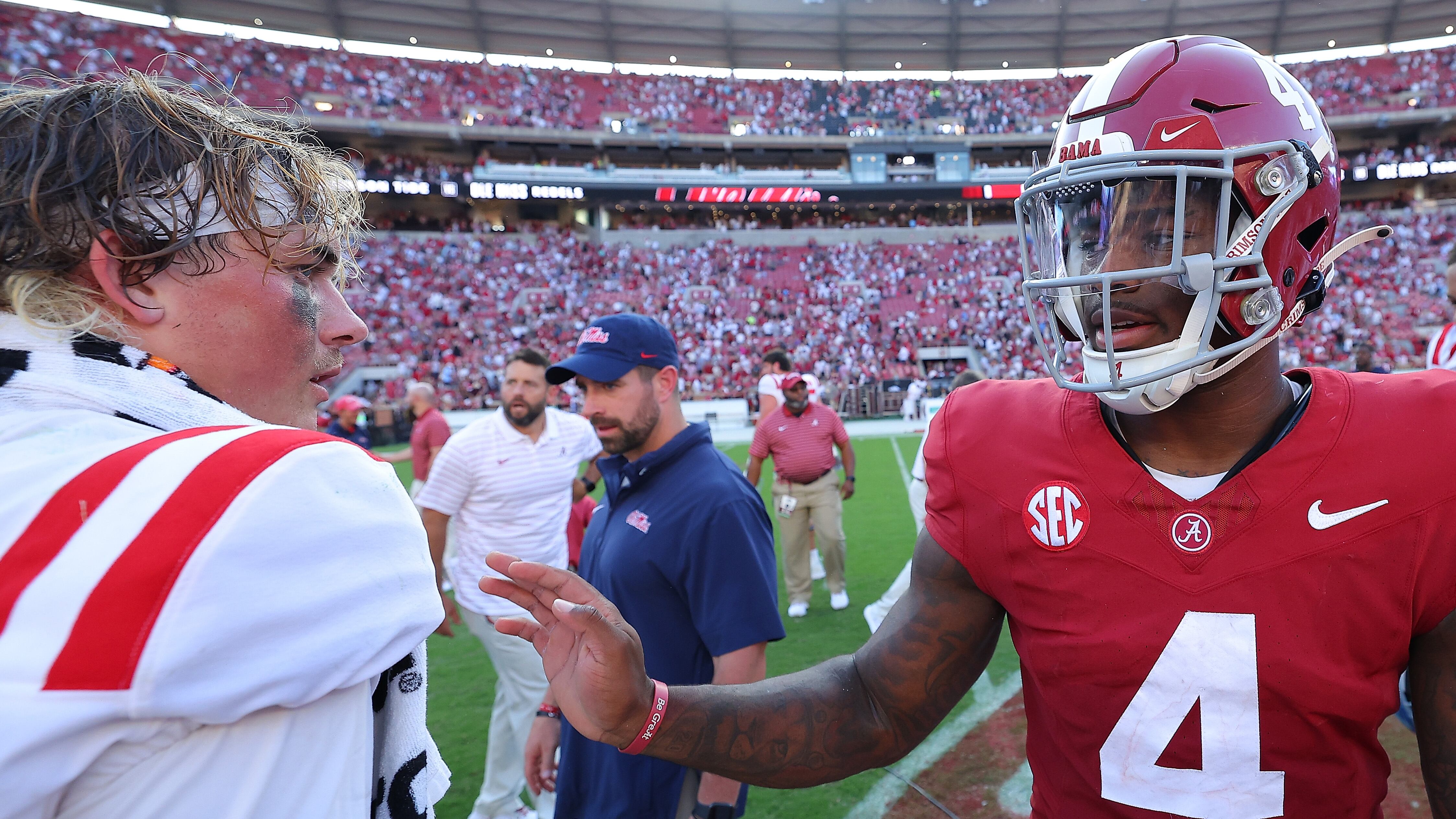 Ole Miss v Alabama TUSCALOOSA, ALABAMA - SEPTEMBER 23: Jalen Milroe #4 of the Alabama Crimson Tide converses with Jaxson Dart #2 of the Mississippi Rebels after their 24-10 win at Bryant-Denny Stadium on September 23, 2023 in Tuscaloosa, Alabama. (Photo by Kevin C. Cox/Getty Images) (Kevin C. Cox/Getty Images)
