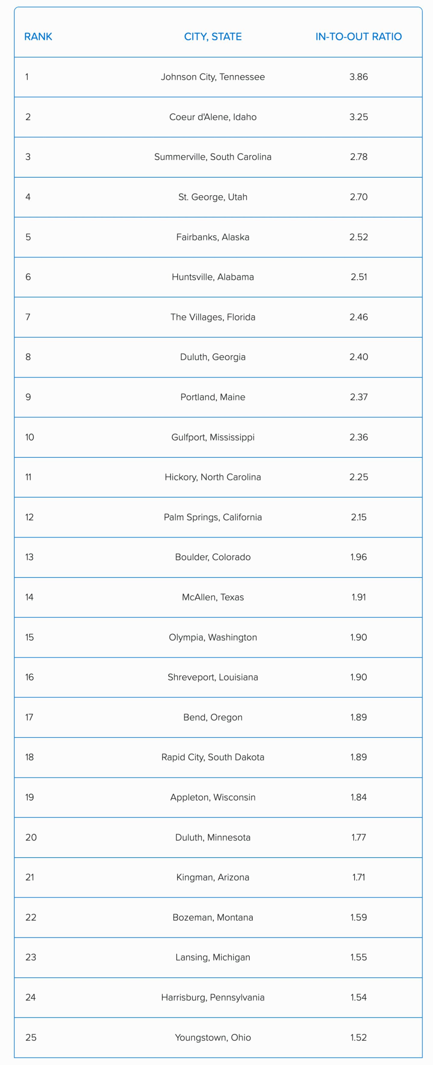 There were four states that didn't have a single city in the dataset with an in-to-out ratio greater than "1" meaning there was not technically a top "move to" city according to mover search data. These cities, instead, were the least "moved out" of cities in their state: