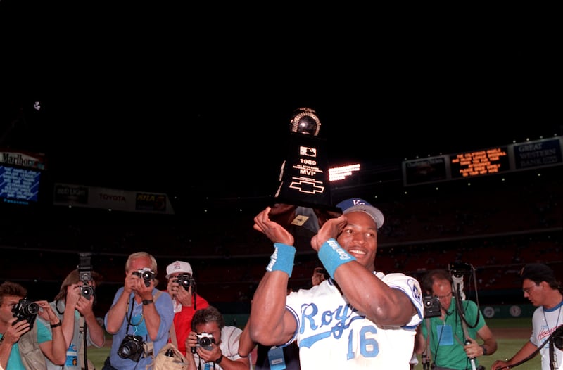 Photos: Bo Jackson through the years 1989: Bo Jackson holds up the MVP trophy after receiving the honor at the All-Star game in Anaheim, California, Tuesday, July 11, 1989. Jackson went 2-4 with a home run and a single and was credited with one stolen base. (AP Photo/Reed Saxon)