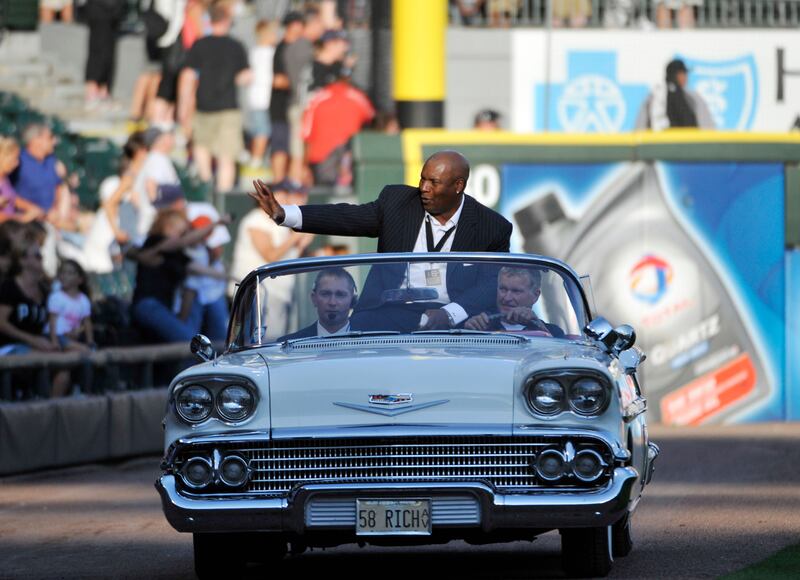 Photos: Bo Jackson through the years 2013: Former baseball and football player Bo Jackson is recognized on the field as a MLB Beacon Award recipient before the game between the Chicago White Sox and the Texas Rangers baseball game Saturday, Aug. 24, 2013, in Chicago. The teams were playing in the seventh annual Civil Rights Game. (AP Photo/David Banks)