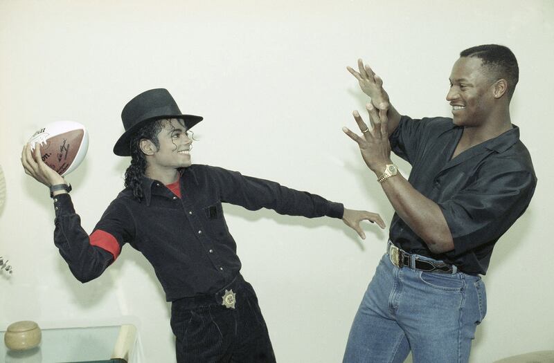 Photos: Bo Jackson through the years 1989: Michael Jackson fakes a pass to Bo Jackson of the Los Angeles Raiders and Kansas City Royals at Michael's recording studio in Los Angeles, Tuesday, Nov. 28, 1989. Bo stopped by for a visit and gave Michael an autographed football and a baseball. (AP Photo/Kevork Djansezian)
