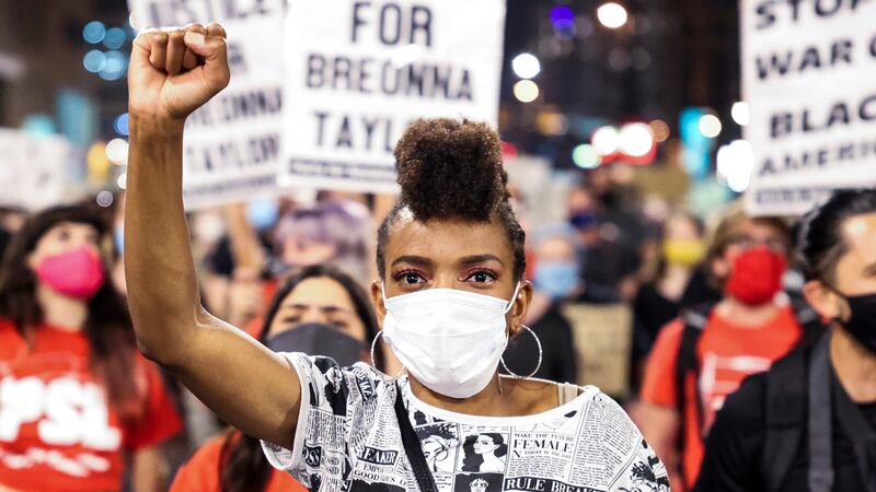 Protests continue after charging decision announced in Breonna Taylor's death Members of Black Lives Matter (BLM) are joined by hundreds of others during an evening protest against the Kentucky grand jury decision in the Breonna Taylor case outside of the Barclays Center on September 23, 2020, in the Brooklyn borough of New York City. (Spencer Platt/Getty Images)