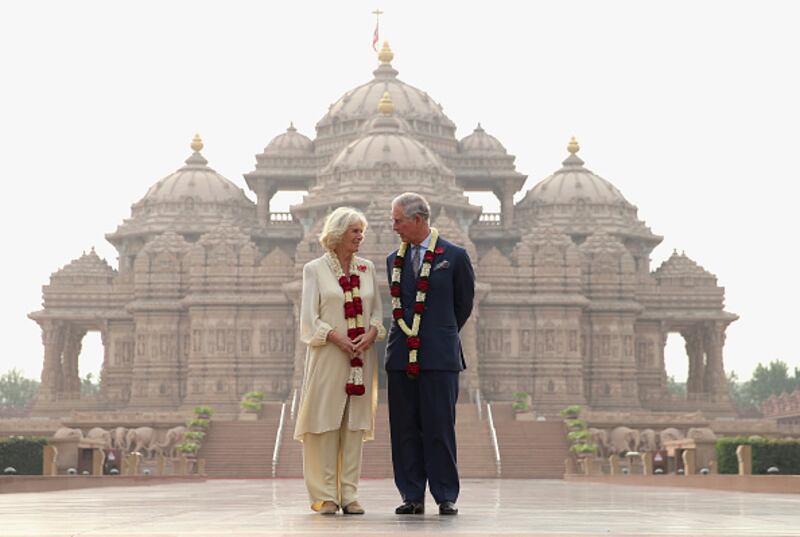 Through the years Camilla, Duchess of Cornwall and Prince Charles, Prince of Wales pose outside the Akshardham Temple during day 3 of an official visit to India on November 8, 2013 in Delhi, India. This will be the Royal couple's third official visit to India together and their most extensive yet, which will see them spending nine days in India and afterwards visiting Sri Lanka in order to attend the 2013 Commonwealth Heads of Government Meeting. (Photo by Chris Jackson/Getty Images) (Chris Jackson/Getty Images)