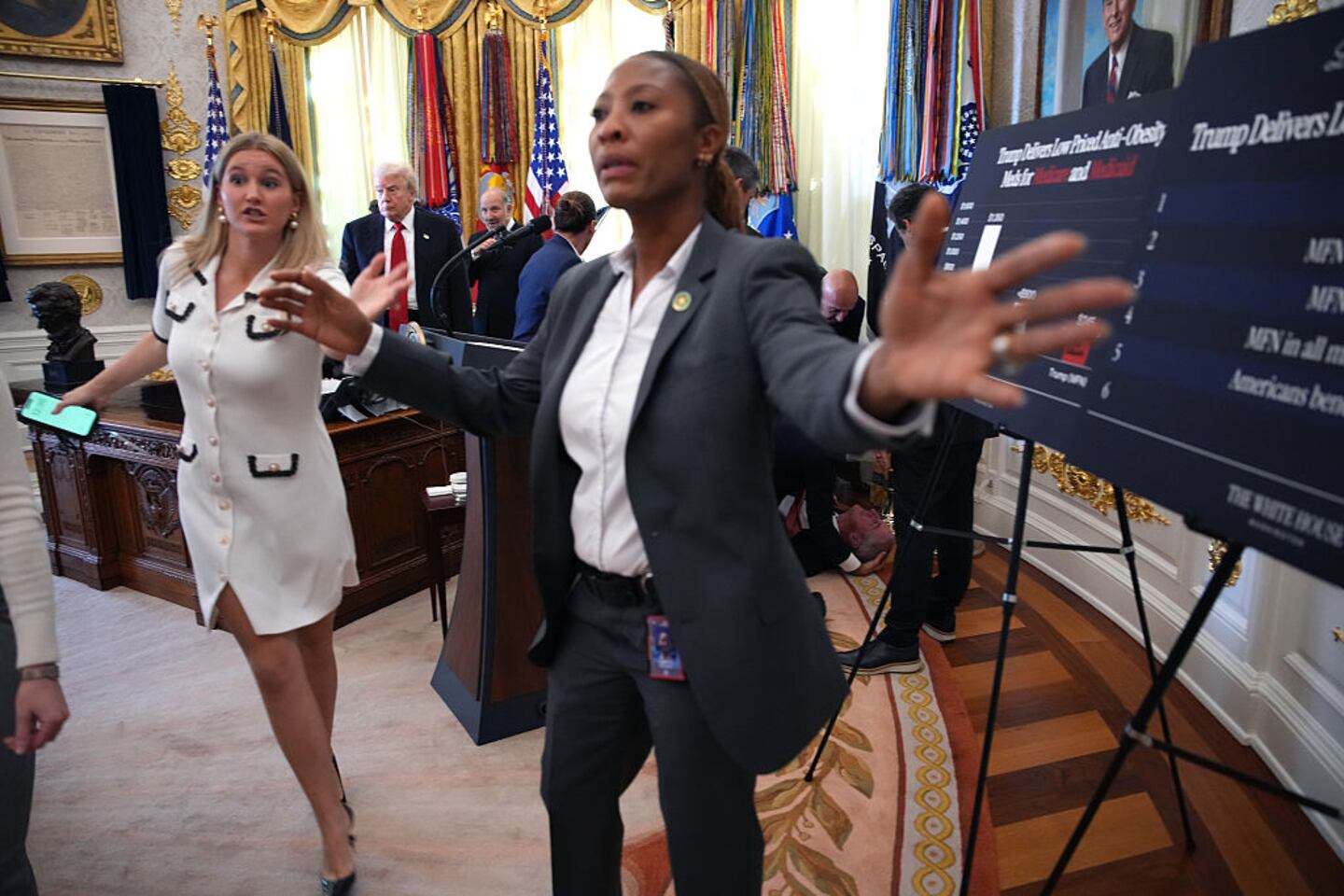 A press conference concerning the lowering of some obesity drug prices by President Donald Trump’s administration was abruptly stopped when one of the people there collapsed.