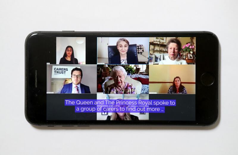 Queen Elizabeth II through the years 2020: In this photo illustration, Anne, Princess Royal, and Queen Elizabeth II speak to carers via video call to mark Carers Week 2020 on June 11, 2020, in London. (Chris Jackson/Getty Images)