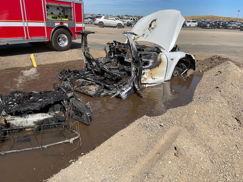 Crews said in the post that they eventually dug a pit, put the car inside it, and filled it with enough water to submerge the car’s battery compartment and prevent it from continuing to reignite.