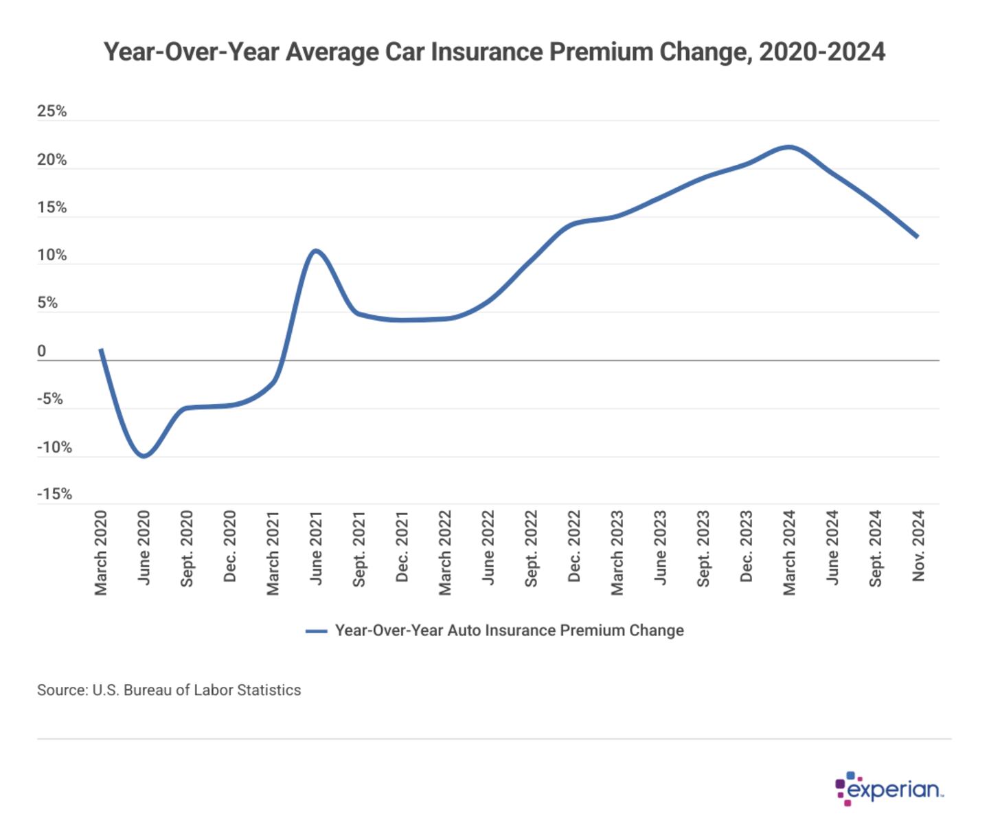 The chart below shows trends in auto insurance premiums from January 2020 to November 2024. In 2023 alone, auto insurance premiums rose by 17.9%. As of November 2024, the average premium has risen by 18.5% year-to-date.